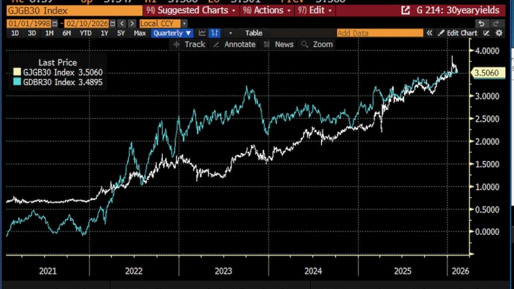 30-jährige Staatsanleihenrenditen: Japan (weiß), Deutschland (weiß); Quelle: Bloomberg
