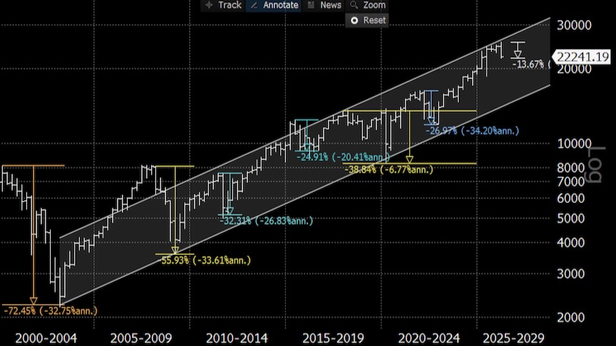 Die aktuelle Korrektur von rund 13,7 % seit dem Hoch wirkt vor diesem Hintergrund noch nicht außergewöhnlich tief. Historisch wäre weiteres Abwärtspotenzial im Rahmen des Trendkanals durchaus möglich.