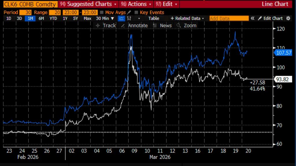 Brent (blau) vs. WTI Ölpreis (weiß), Quelle: Bloomberg