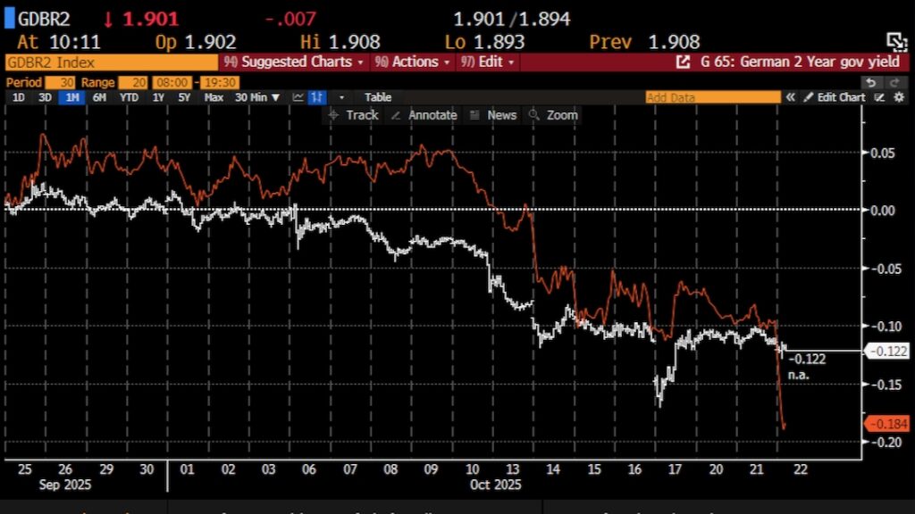 Erstmals seit über einem Jahr blieb die Inflation im Vereinigten Königreich unverändert bei 3,8 % – niedriger als von der Bank of England erwartet. Sinkende Lebensmittelpreise glichen steigende Energiekosten aus, ein weiteres Zeichen, dass der Inflationsdruck abnimmt. An den Terminmärkten stieg daraufhin die Wahrscheinlichkeit einer ersten Zinssenkung im Dezember auf rund 70 %. Für das Pfund bedeutete das leichten Druck, für die Aktienmärkte jedoch Entlastung: Das Risiko, dass die BoE zu lange an einem zu restriktiven Kurs festhält, sinkt spürbar. Auch die Renditen reagierten deutlich. Die zweijährige UK-Staatsanleihe fiel stark – wie der folgende Vergleich mit den zweijährigen Bundesanleihen zeigt: