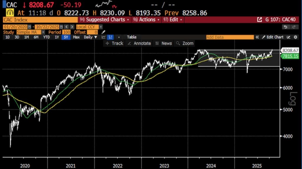 Auch auf dem europäischen Festland überwiegen positive Signale. Der französische Leitindex CAC 40 stieg gestern auf 8 258 Punkte – ein neues Allzeithoch. Starke Unternehmenszahlen, insbesondere von LVMH, EssilorLuxottica und Kering, überlagerten die jüngste Herabstufung Frankreichs durch S&P Global Ratings. Die Pariser Börse hat damit zu ihren europäischen Pendants aufgeschlossen und seit Jahresbeginn rund 12 % zugelegt – nahezu im Gleichschritt mit dem STOXX Europe 600, auch wenn der DAX weiterhin vorne liegt.