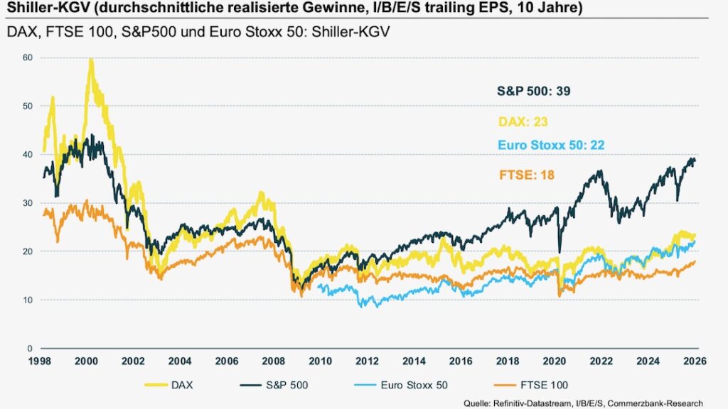 Ein Blick auf die Bewertungen mahnt jedoch zur Einordnung. Der Shiller-KGV des S&P 500 liegt bei rund 39 und damit in einem historisch anspruchsvollen Bereich. Der Shiller-KGV (auch CAPE genannt) setzt den aktuellen Indexstand ins Verhältnis zu den durchschnittlichen, inflationsbereinigten Unternehmensgewinnen der vergangenen zehn Jahre. Ziel ist es, kurzfristige Gewinnspitzen und -einbrüche zu glätten und so ein robusteres Bild der langfristigen Bewertung zu erhalten. Europa erscheint im Vergleich deutlich moderater bewertet: DAX ca. 23, Euro Stoxx 50 rund 22, FTSE 100 etwa 18.