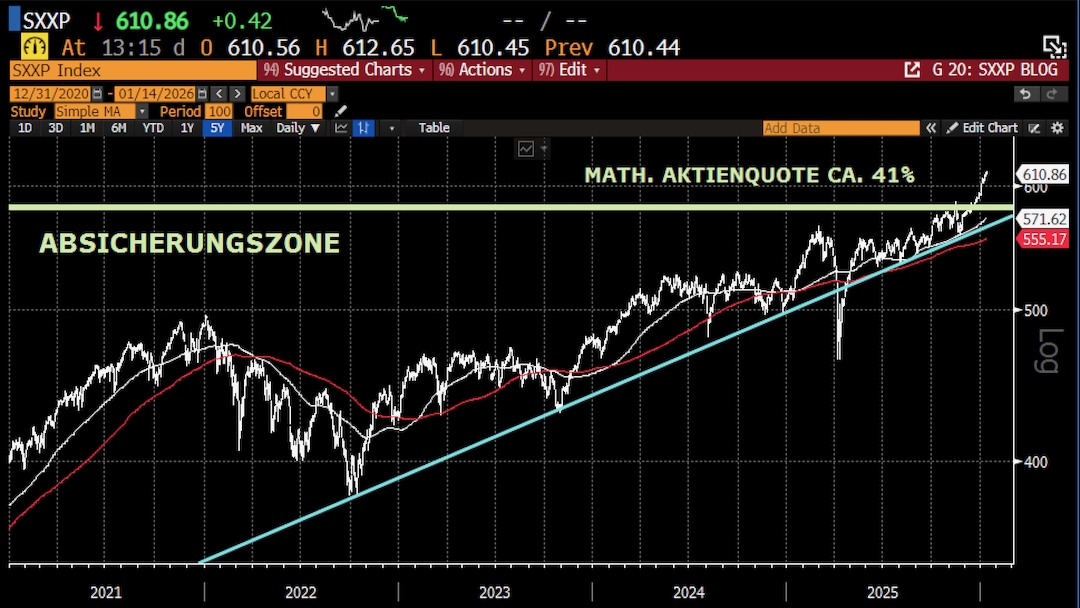 Das Schaubild zeigt den STOXX Europe 600 im intakten langfristigen Aufwärtstrend sowie die Absicherungszone im TimmInvest Europa Plus Fonds, die aufgrund der weiterhin positiven technischen Lage nur sehr behutsam und Schritt für Schritt nach oben angepasst wird. Trotz neuer Höchststände liegt die mathematische Aktienquote aktuell bei lediglich rund 40 %. Das ist kein Ausdruck von Skepsis, sondern von Disziplin: Teilnahme an steigenden Märkten ja – aber mit Augenmaß und mit einer kontinuierlichen Anpassung der Absicherungsinstrumente. Diese bestehen in erster Linie aus Put-Optionen zur Absicherung der Abwärtsrisiken, ergänzt durch verkaufte Call-Optionen, die in ruhigen Marktphasen zusätzliche Erträge liefern.