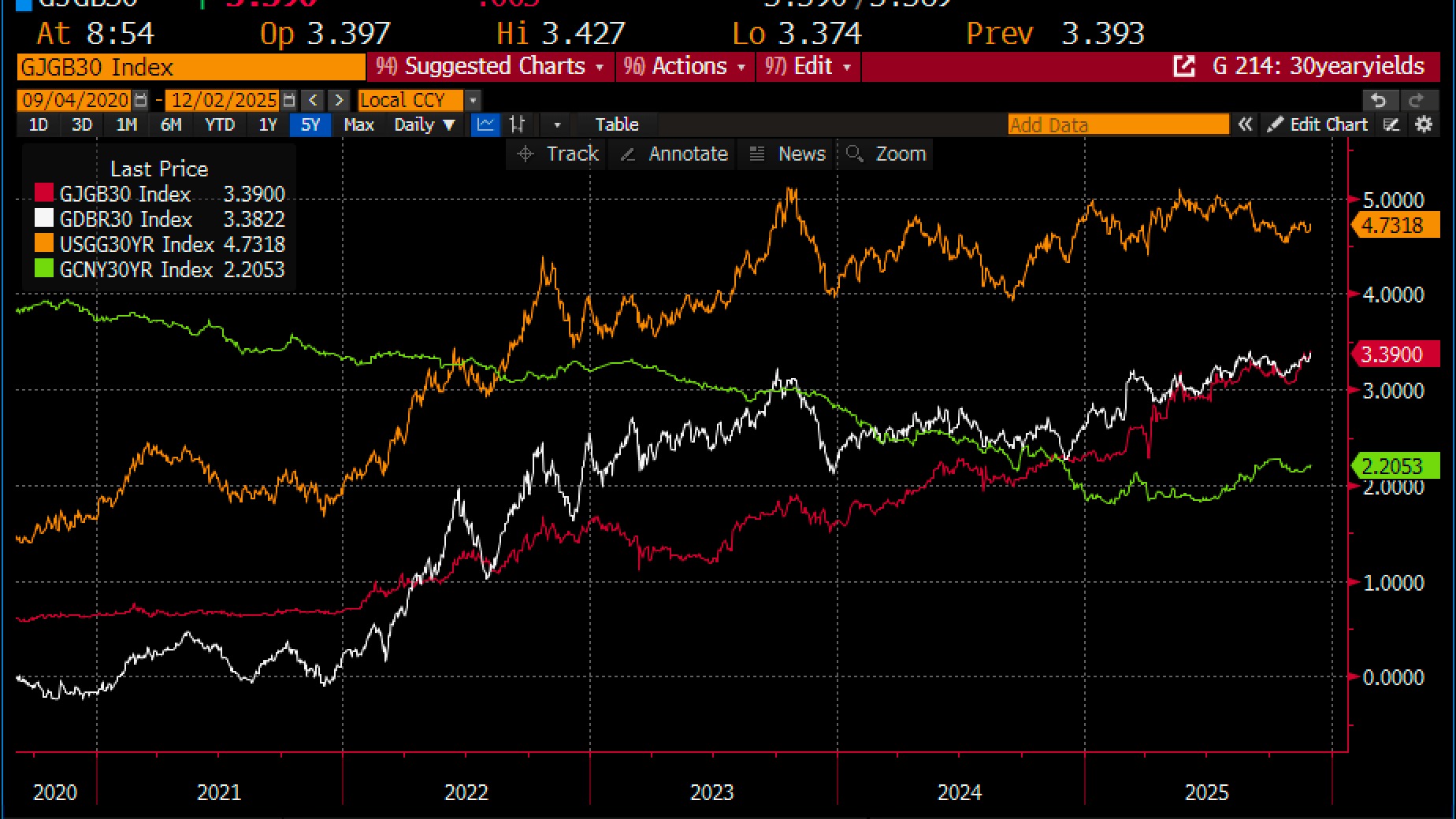 30-jährige Renditen Staatsanleihen: USA (orange), Deutschland (weiß), Japan (rot), China (grün), Quelle: Bloomberg