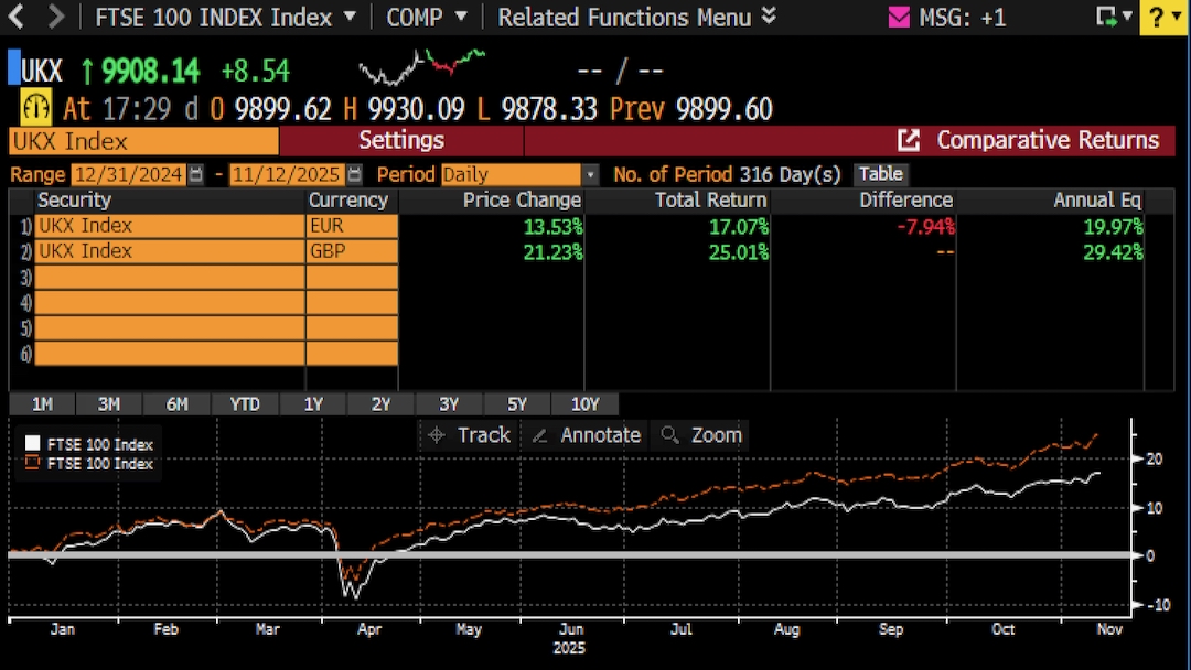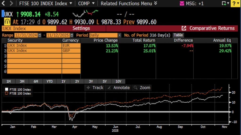 FTSE 100 Index Wertentwicklung 2025; Quelle: Bloomberg