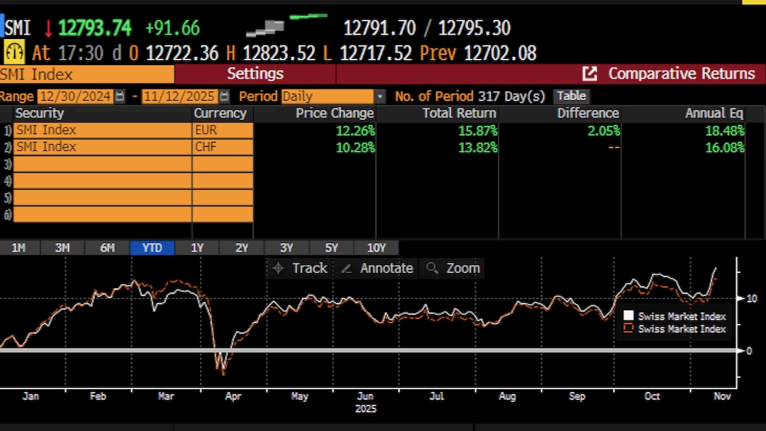 Die Aussicht auf eine Entspannung führte sofort zu freundlichen Marktreaktionen: Der SMI legte in dieser Woche deutlich zu – allen voran Luxus- und Industrieunternehmen wie Richemont, Swatch und Partners Group. Auch die in London gelisteten Aktien von Watches of Switzerland stiegen kräftig. Gleichzeitig wertete der Schweizer Franken moderat zum Euro auf – ein Signal wachsender Zuversicht. Das folgende Schaubild zeigt die Performance des SMI in EUR0 (weiss) und CHF (rot). Hier wirkte die Währung positiv auf die Euro-Rendite.