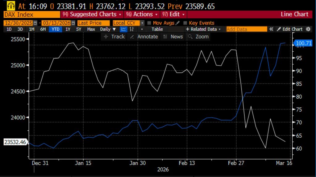 In der zweiten Kriegswoche bewegte sich der DAX im Großen und Ganzen parallel zum Ölpreis.