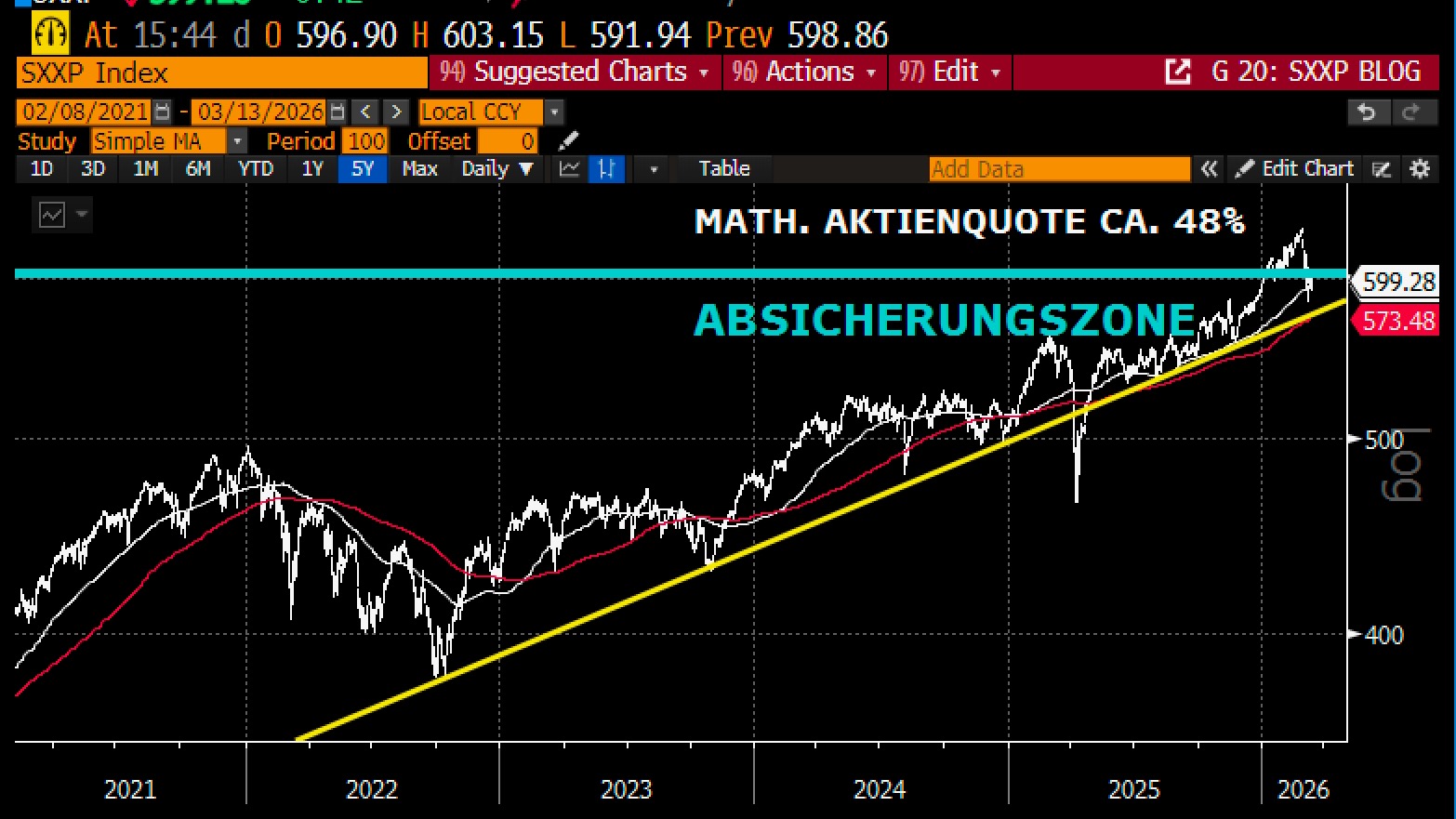 Aktuelle Ausrichtung des Fonds: 100 % Absicherung ab Beginn der Absicherungszone bei 605 Indexpunkten (Durchschnitt aller Basispreise der über EUREX gekauften STOXX Europe 600-Absicherungsoptionen). Achtung: Durch die Absicherung entstehen Kosten. Der Abstand zum aktuellen Indexstand des STOXX Europe 600 bei 595,54 Indexpunkten beträgt derzeit ca. 1,59 %.