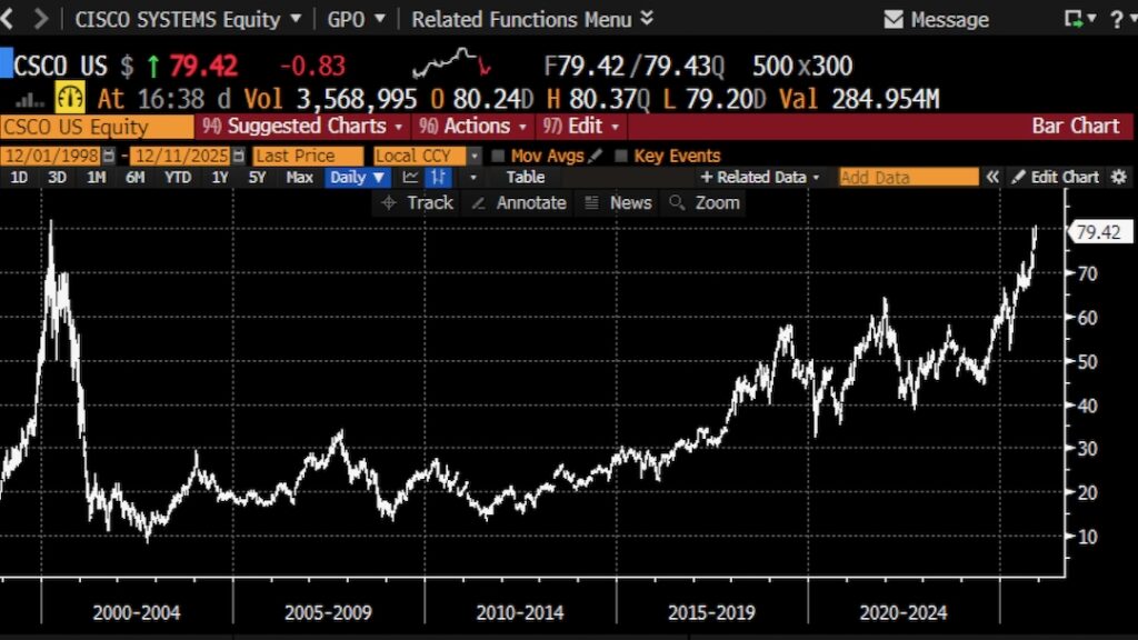 Mit einem Augenzwinkern lohnt zum Schluss ein Blick auf Cisco, das im Jahr 2000 zum Symbol der Dotcom-Euphorie wurde und kurzzeitig das wertvollste Unternehmen der Welt war – bevor der Technologieboom kollabierte.