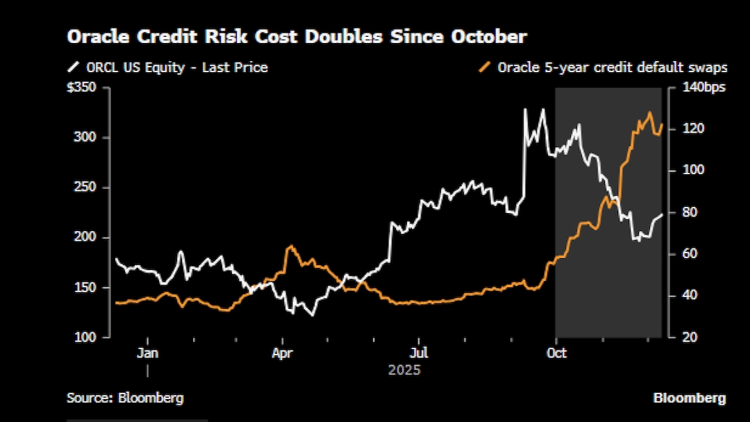 Oracle kündigte gestern zusätzliche 15 Mrd. USD CapEx für 2026 an. CapEx (Capital Expenditures) bedeutet dabei schlicht: Investitionen in Rechenzentren, Hardware und Cloud-Infrastruktur. Während Alphabet oder Meta ihre Investitionen über starke Cashflows stemmen können, muss Oracle stärker auf Fremdkapital zurückgreifen. Die Aktie reagierte entsprechend mit einem deutlichen Abschlag. Zugleich stiegen die Credit Default Swaps des Unternehmens – ein CDS ist nichts anderes als ein Marktindikator für steigende Ausfallrisiken – deutlich an.